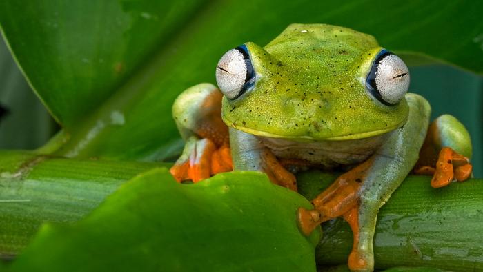 The number of species increases unevenly from local ecosystems to continental scales. Such patterns are described through so-called Species-Area Relationships (SARs). The photo shows a tropical tree frog, probably Rhacophorus malabaricus