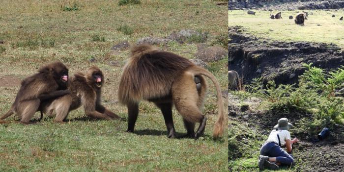 Left: a gelada male attacks two females, who respond with screams and bared-teeth facial expressions. Right: one of the study subjects, feeding, is about to receive the audio stimulus; the experimenter (Luca Pedruzzi) remains hidden behind vegetation, with the loudspeaker concealed from the subject’s view.