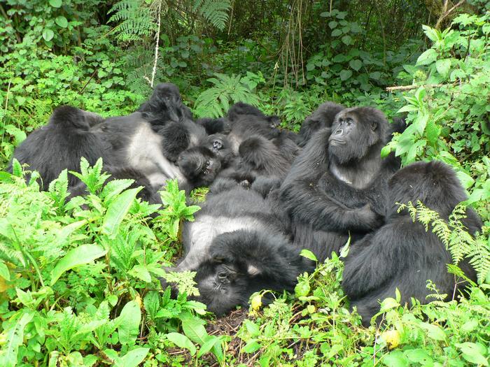 A family of mountain gorillas resting together, in Volcanoes National Park, Rwanda. Resting in physical contact is an indicator of close social relationships and tolerance in gorillas.