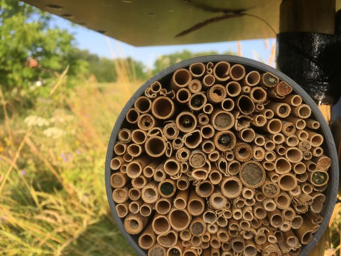 Bees wait asleep in an artificial nest made of reed stems for favorable flight conditions. Different species close their nest entrances with clay or plant debris.