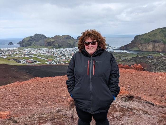 Dr Rhian Hedd Meara standing on Eldfell, the volcano that reshaped Heimaey in 1973, during filming of Isle of Fire.