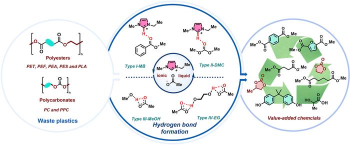 This diagram illustrates the process of upcycling waste plastics, including various polyesters (PET, PEF, PEA, PES, PLA) and polycarbonates (PC, PPC), using ionic liquid catalysts. The method involves the formation of hydrogen bonds between the ionic liquid and reactants, facilitating the transformation of PET into valuable chemicals such as dimethyl terephthalate (DMT) and ethylene carbonate (EC). The process efficiently depolymerizes PET and other plastics, offering a sustainable approach to plastic recycling and contributing to a circular economy.
