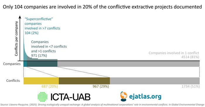 Just one hundred corporations are behind a fifth of the documented extractive conflicts worldwide, exposing how companies from the Global North seize resources and profits, while social and ecological harms are imposed on the Global South, according to a recent study by Institute of Environmental Science and Technology at the Universitat Autònoma de Barcelona (ICTA-UAB).