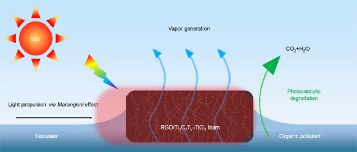 The system—designed as a lightweight, porous foam structure—integrates three critical functions: photocatalytic degradation, solar steam generation, and self-propulsion under light. It is composed of a hybrid material that combines reduced graphene oxide, Ti₃C₂Tâ‚“, and in situ grown TiO₂ nanoparticles, enabling the structure to respond efficiently to sunlight across a broad spectrum.