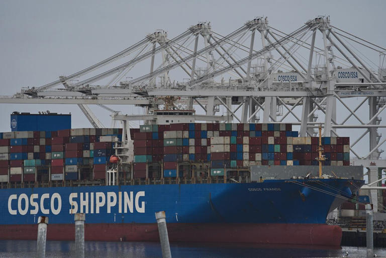 The Cosco Shipping France container ship moored at the Long Beach Container Terminal in the Port of Long Beach, Calif., in April. The court ruling could embolden the U.S.'s European trading partners and make them hesitant to enter into tariff negotiations. (Damian Dovarganes/The Associated Press)