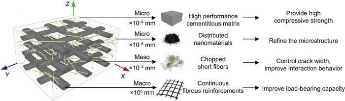 Schematic of multiscale fiber-reinforced cementitious composite.