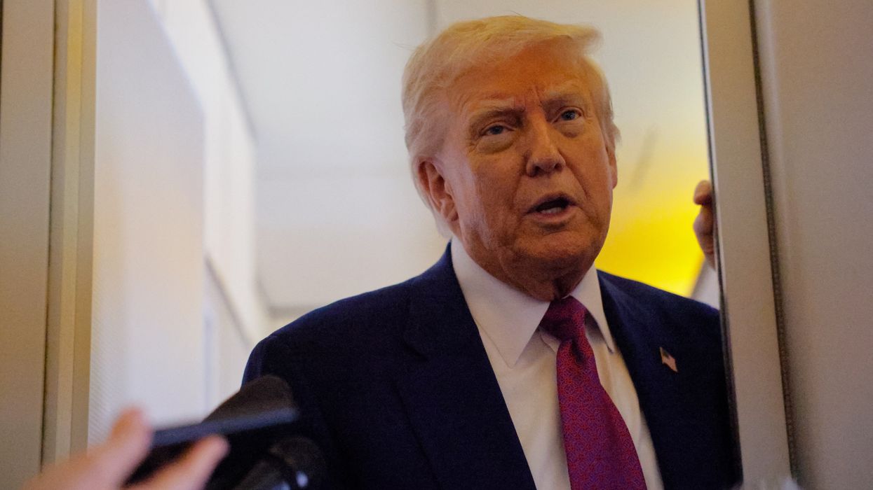 U.S. President Donald Trump talks to reporters aboard Air Force One, en-route to Abu Dhabi, United Arab Emirates, May 15, 2025. REUTERS/Brian Snyder