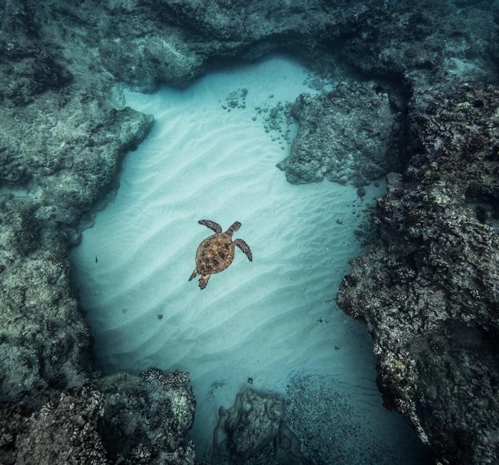 A sea turtle swims in a coral reef in Hawaii. Ocean acidification, found to be on the brink of crossing a boundary into higher-risk territory, can affect coral skeleton formation.
