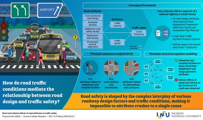 To address this gap, researchers from Incheon National University, led by Assistant Professor Wookjae Yang, conducted a study examining how different road design elements and traffic conditions interact to affect the likelihood of crashes. Using data from a 68-kilometer segment of a national highway in South Korea, the team applied principal component analysis (PCA) and piecewise structural equation modeling (PSEM) to examine both direct and indirect effects of road attributes on two major crash types: head-on and run-off crashes. This study was made available online on February 20, 2025, and published in Volume 93 of Journal of Safety Research on July 1, 2025.