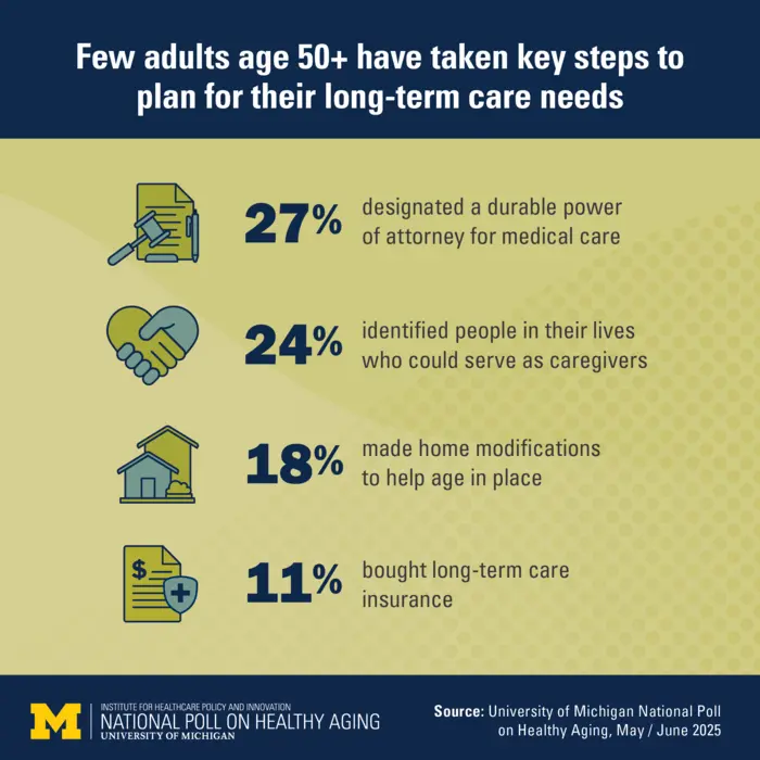 The poll, designed with help from two U-M geriatrics specialists who study long-term care, also asked adults aged 50 and over if they had taken any one of five key actions to prepare for eventual long-term care needs.