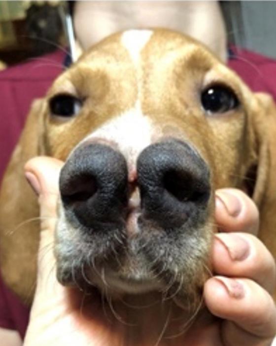 A mixed breed dog with a forked nose.