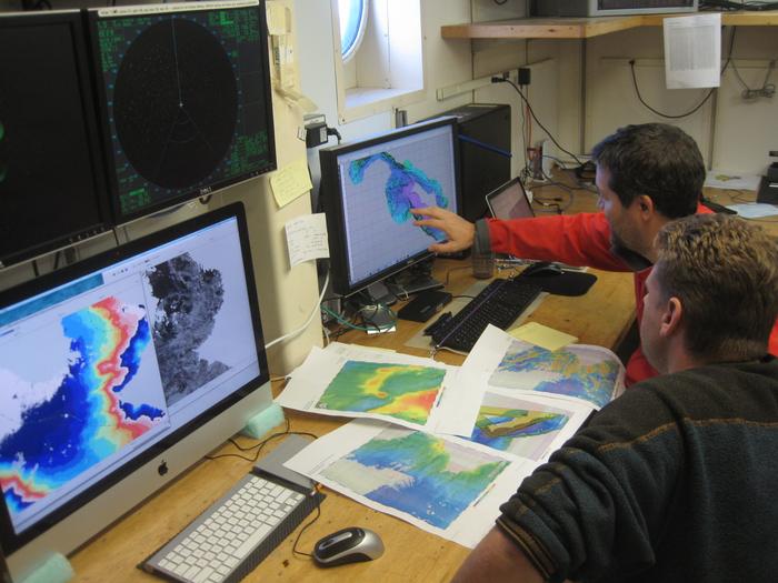 Co-lead scientists Jasper Konter and Matt Jackson look for a suitable sampling site using data of seamount collected with the research ship's sonar system.