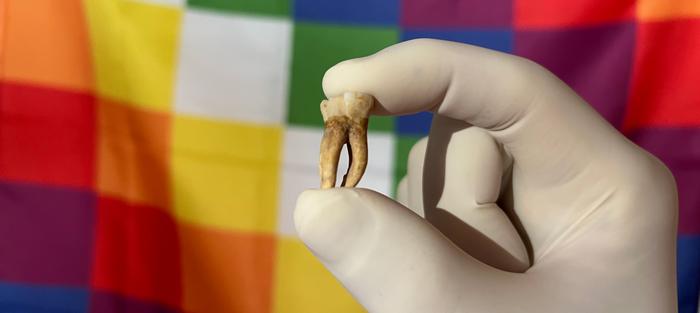 From this type of sample, ancient DNA techniques enable the reconstruction of human and pathogen genomes from the past. In the back, a Wiphala flag representing Indigenous communities of South America.