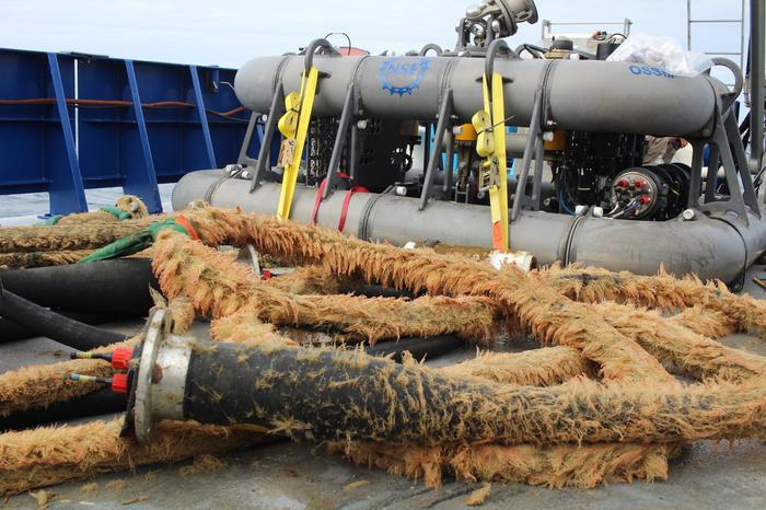 Algae growth on an Ocean Observatories Initiative (OOI) Surface Mooring, which measured water properties and velocity at the US Northeast shelfbreak, right after recovery.