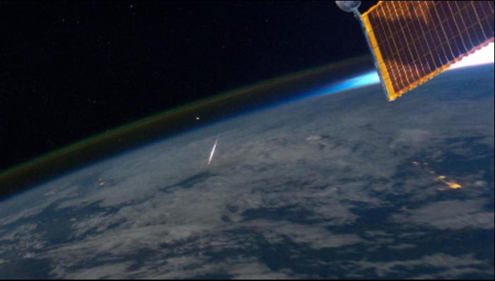 This photograph taken by an International Space Station astronaut shows a bright meteor from the Perseid meteor shower in Earth’s atmosphere. The brightest meteors are known as fireballs, or bolides