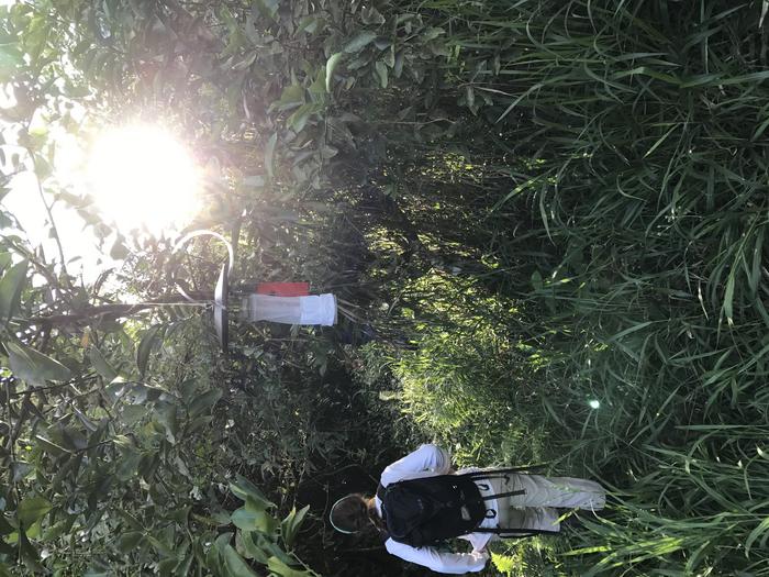 Study co-author Meghan Howard checks a battery-powered mosquito trap.