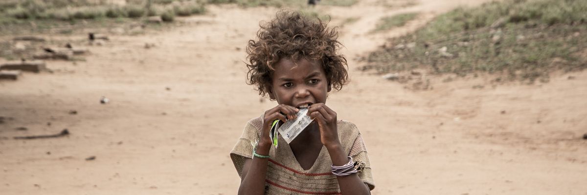 A girl eats a food supplement distributed during a malnutrition screening session organized by the NGO Action Contre la Faim and the World Food Program (WFP) in the municipality of Ifotaka, in southern Madagascar, on December 14, 2018.