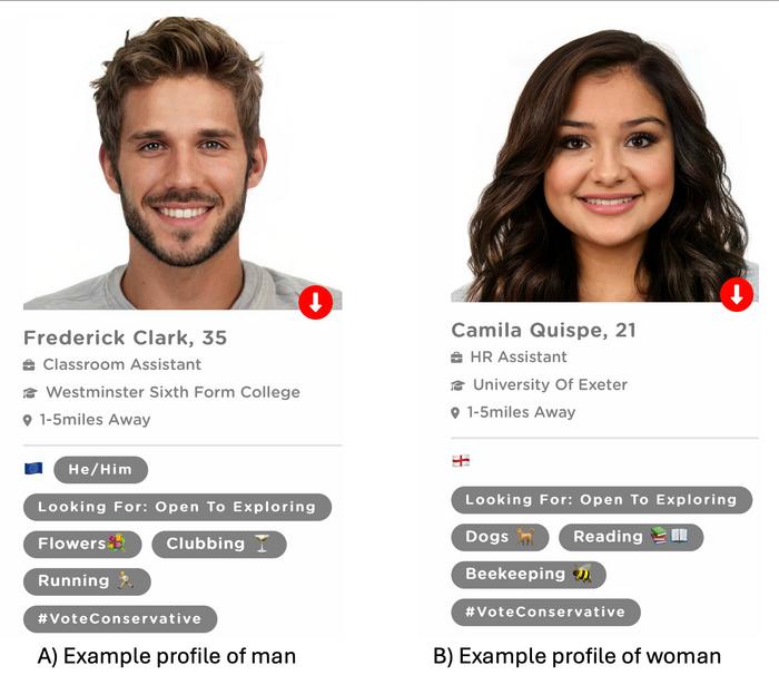 The profiles were AI-generated variations of attractive men and women’s faces. Their bios contained information including their occupation, hobbies, interests, and schooling, and some included an indication of who they voted for.