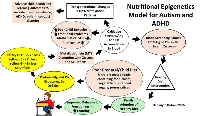 In a recent publication released by PubMed, American scientist Dr. Renee Dufault at the Food Ingredient and Health Research Institute, provides a peer-reviewed protocol for determining the role ultra-processed foods play in prenatal heavy metal exposures and changes in the expression of the zinc dependent MT-1 (metallothionein) gene that impact child neurodevelopment. Previous biomarker studies show dietary zinc deficits impact metallothionein protein levels and are associated with the bioaccumulation of lead and/or mercury in children with symptoms associated with autism and attention deficit/hyperactivity disorders. This protocol builds on the results of previous clinical trial research and provides valid and reliable methods for measuring changes in ultra-processed food intake and diet pre-post administration of nutritional epigenetics education. The impact of dietary changes on lead and mercury exposures and MT gene behavior would be determined using a randomized test and control group design. Pregnant women serving in the test group would participate in the nutritional epigenetics education intervention designed to reduce ultra-processed food intake and heavy metal levels in blood while increasing whole food intake and MT and zinc levels. Changes in maternal lead mercury, zinc, and metallothionein levels would be measured via blood sample analyses prior to the nutritional epigenetics education intervention and after childbirth via cord blood analyses to determine infant risk factors for the development of autism and/or attention deficit/hyperactivity disorders.