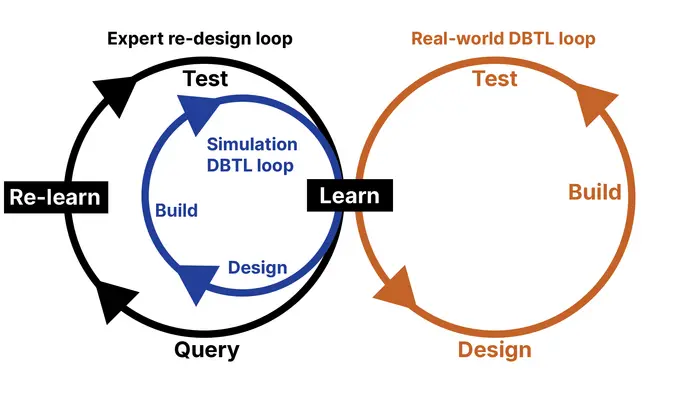 Real-world scientific research, for example, iteratively improves through learning in the design-build-test-learn loop (on the right). On the left, active re-learning from expert human knowledge in parallel with simulation in the design-build-test-loop. In combination, a solution for machine learning that can be robustly deployed ‘out-of-distribution’ i.e. outside of its learning context, which can lead to accelerated breakthroughs in R&D.