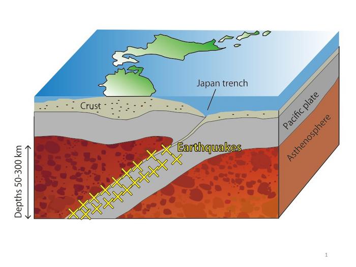 Intermediate earthquakes occur in the subducting slabs at depths of 50-300 km. Hypocenters of intermediate earthquakes form seismic zones.