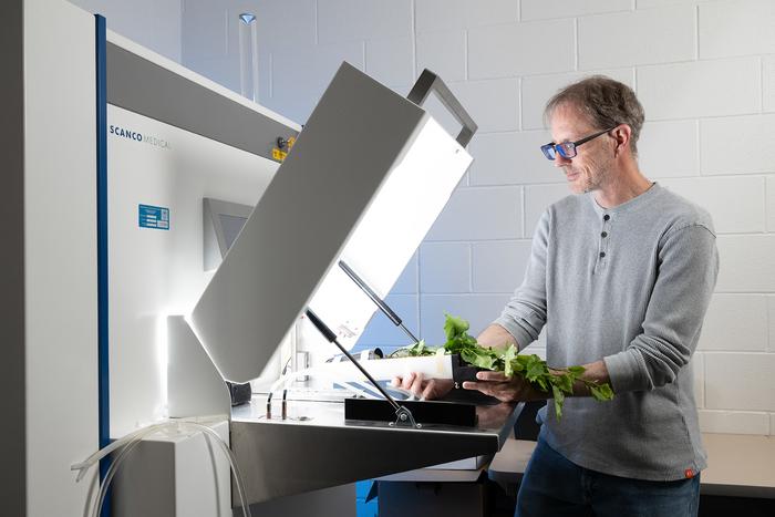 USDA Agricultural Research Service scientist Sean Gleason uses a micro-CT scanner at a Colorado State University lab to study plants. The machine allows Gleason and his CSU collaborators to view internal plant processes non-destructively. Photo by John Eisele/CSU