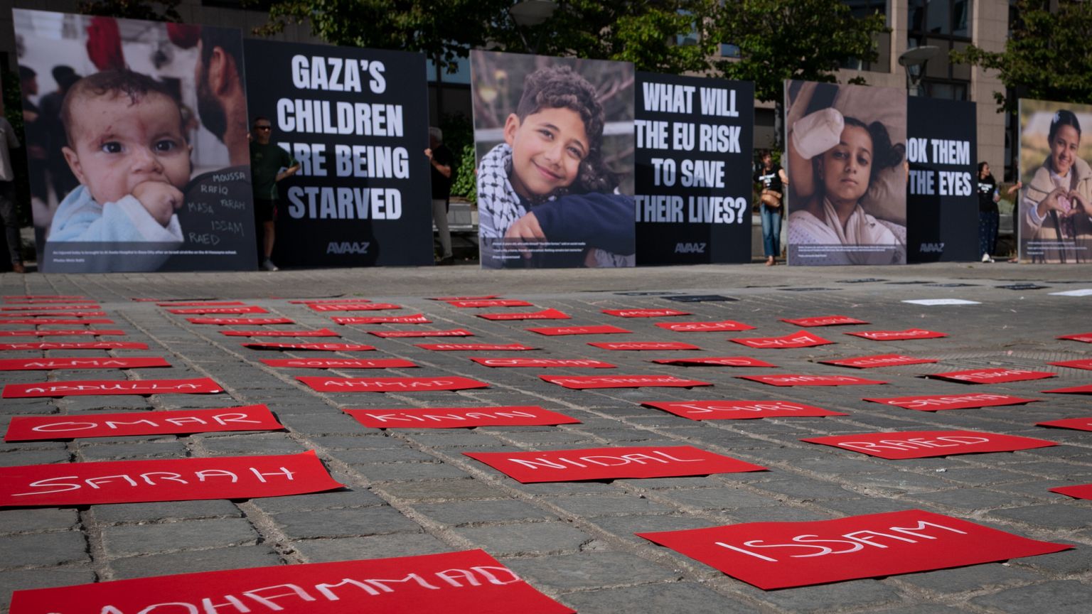 Flynn spoke against the backdrop of a street installation organised by Avaaz in the Belgian capital on Wednesday and Thursday, which included giant portraits of Palestinian children, overlooking hundreds of names, flowers, stuffed animals and other toys.
