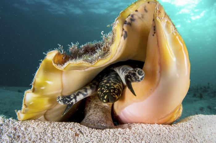 An adult queen conch (Aliger gigas) in The Bahamas.
