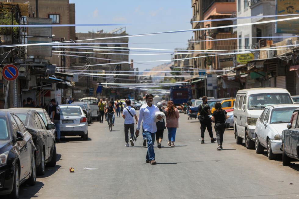 People walk beneath white ribbons stretched across the street in sign of mourning, near the Saint Elias church © Bakr ALKASEM / AFP