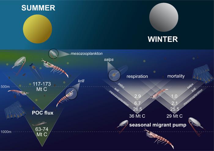 Left panel: The traditional view of how zooplankton transport carbon to depth by eating phytoplankton in surface waters in summer, whereby their waste material (Particulate Organic Carbon, POC) sinks passively to great depth, thereby storing the carbon for thousands of years. Right panel: This new study shows that a winter process known as the ‘seasonal migrant pump’ also leads to a substantial deep carbon storage. The zooplankton migrate downwards in autumn to overwinter below 500m where their respiration and death directly inject around 65 million tonnes of carbon annually into the deep ocean.