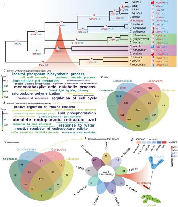 (a) Gene family expansion and contraction of M. boisiana. (b) Functional (GO) enrichment for the Convolvulaceae node. (c) Functional (GO) enrichment for the Convolvulaceae unique. (d) OGS overlap among Convolvulaceae, Solanaceae, Rubiaceae, and Asteraceae. (e) LAGLIDADG_1’s expression of M. boisiana. (f) Convolvulaceae unique Pfam domains. (g) Pfam domains overlap among Convolvulaceae, Solanaceae, Rubiaceae, and Asteraceae.