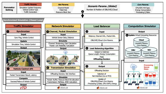 Currently, autonomous vehicle systems typically process all sensor data inside the vehicle or offload some data to a VEC server. However, in situations with high data collection and processing volumes, such as in urban traffic environments, bottlenecks in network and computing resources can occur in a complex manner, affecting the stability of autonomous driving. To deal with this problem, Prof. Choi Ji-woong’s team at DGIST collaborated with Prof. Kwak Jung-ho’s team at Korea University to design a simulator framework that integrates computational and communications resources between the onboard unit (OBU) in the vehicle, the VEC server, and the cloud server. On this basis, they also developed a dynamic offloading and dynamic voltage and frequency scaling (DVFS) algorithm.