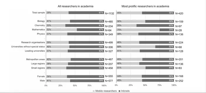 The analysis was conducted on two levels. First, the author examined all 1,132 PhD holders who remained in academia during the first eight years following their dissertation defence. Among this group, the rate of academic inbreeding was 61%. The results showed that graduates who moved to different universities after earning their degrees were, on average, more likely to publish, have articles accepted in prestigious journals, and receive higher citation counts compared to those who remained at their alma mater.