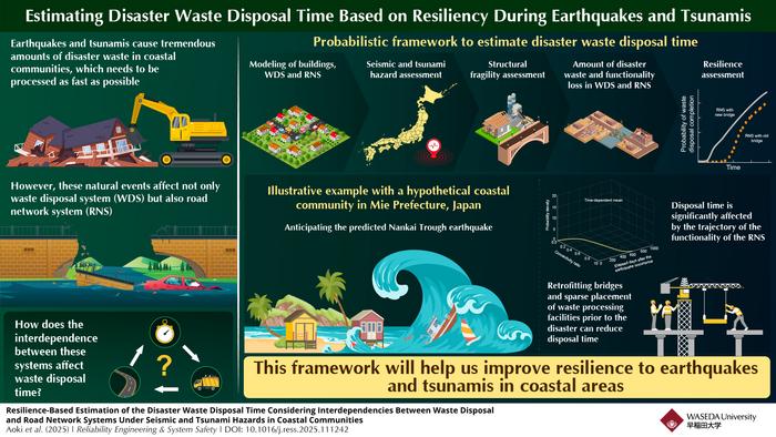 Against this backdrop, a research group led by Professor Mitsuyoshi Akiyama and Adjunct Researcher Koki Aoki from Waseda University, Japan, has developed a novel probabilistic framework for estimating the disaster waste disposal time in coastal communities under the combined threat of seismic and tsunami hazards. Their latest study, which was made available online in Reliability Engineering & System Safety on May 14, 2025 and will be published in Volume 262 in October 2025, focuses on key interdependencies between WDS and RNS, offering a more realistic prediction of post-disaster recovery timelines. The study was co-authored by Adjunct Researcher Koki Aoki from Waseda University, Japan; Professor Mitsuyoshi Akiyama from Waseda University, Japan; Assistant Professor Abdul Kadir Alhamid from Bandung Institute of Technology, Indonesia; Professor Dan M. Frangopol from Lehigh University, USA; and Professor Shunichi Koshimura from Tohoku University, Japan.