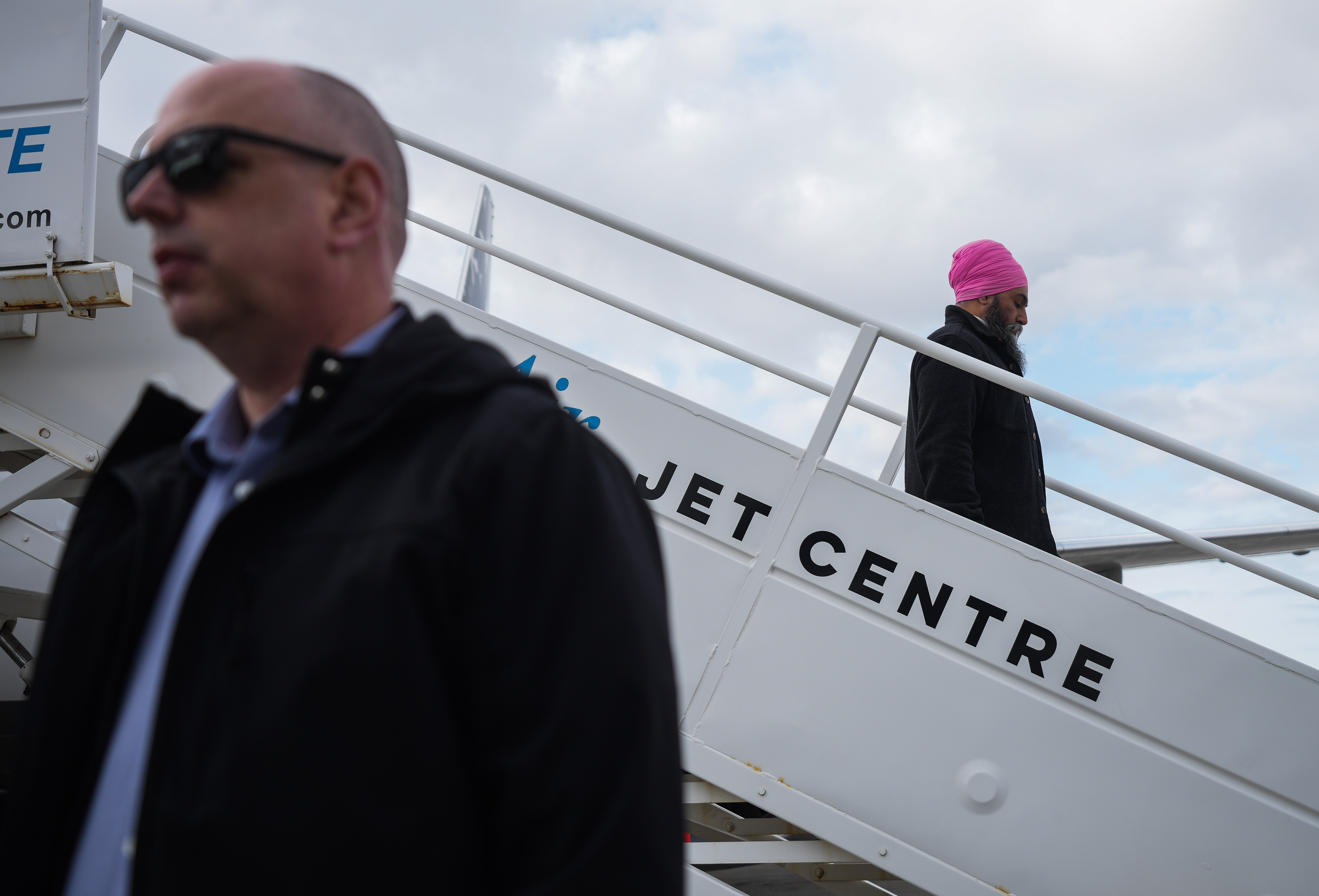 NDP Leader Jagmeet Singh steps off campaign plane as member of his RCMP security detail stands by in Winnipeg, April 23, 2025. THE CANADIAN PRESS/Darryl Dyck.