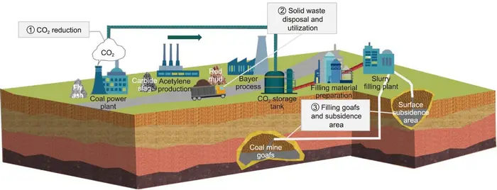 Coal mining, while a significant contributor to global energy supplies, generates substantial amounts of coal mine goafs—voids left by the extraction of coal. These goafs, along with the accompanying solid wastes such as fly ash (FA), carbide slag (CS), and red mud (RM), pose serious ecological and environmental challenges. The study proposes a method to utilize these solid wastes to create cementitious materials for filling coal mine goafs, while simultaneously sequestering CO2 through a mineralization process.