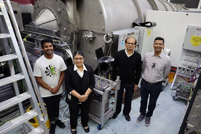 Dr Nisal Wanasingha, Professor Namita Roy Choudhury, Professor Naba Dutta and Associate Professor Jitendra Mata with Quokka, the small angle neutron scattering instrument at the Australian Centre for Neutron Scattering. Credit: ANSTO.