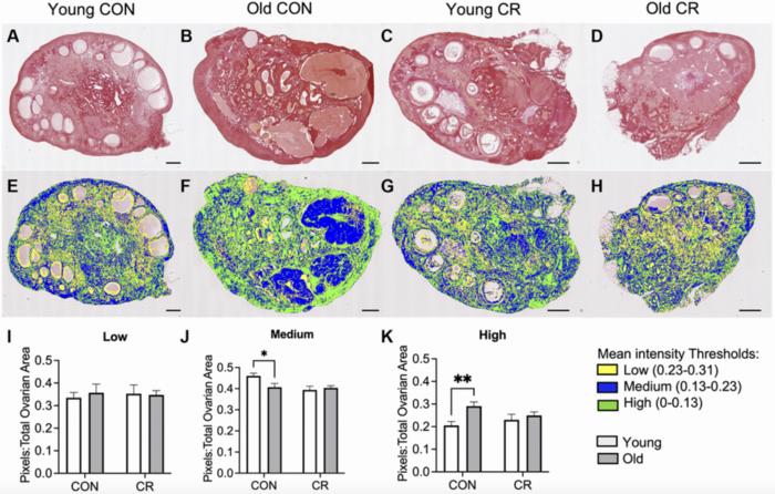 Figure 7. Assessment of collagen I and III in histologic ovarian sections using Picrosirius red (PSR). Representative images of PSR stained ovarian tissue sections for (A) young control, (B) old control, (C) young calorie-restricted (CR), and (D) old calorie-restricted (CR). Corresponding representative images of the quantitative histology algorithm showing intensity of PSR staining, where low intensity pixels are shown in yellow, medium intensity pixels are shown in blue, and high intensity are shown in green for (E) young control, (F) old control, (G) young calorie-restricted (CR), and (H) old calorie-restricted (CR). Bar graphs showing quantification of (I) low intensity, (J) medium intensity, and (K) high intensity pixels. An N = 3 images per animal and N = 4–8 animals per experimental group were analyzed. Data are presented as mean ± SEM. Statistics were calculated using a two-way ANOVA with Sidak’s multiple comparison test. *p ≤ 0.05. **p 0.01. The scale bar is 1 mm.