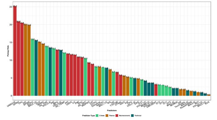 Macroeconomic predictors dominate the pick-up rate, with UNRATE ranking the highest at 25.64%, followed by GPRH at 20.86%, and TPU at 20.80%. These predictors capture key aspects of labor market dynamics, geopolitical risks, and trade policy uncertainty. This aligns with Baumeister et al. (2022), who demonstrated that macroeconomic indicators, such as unemployment rates and economic activity indices, are robust predictors of energy-related market performance.