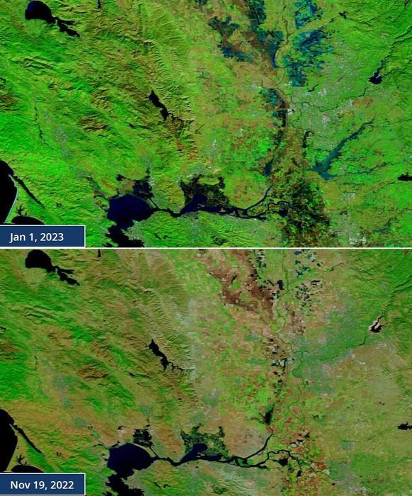 A comparison of images from the MODIS Terra satellite taken January 1, 2023 (top) and November 19, 2022 (bottom) shows the extent of flooding following heavy rains.
