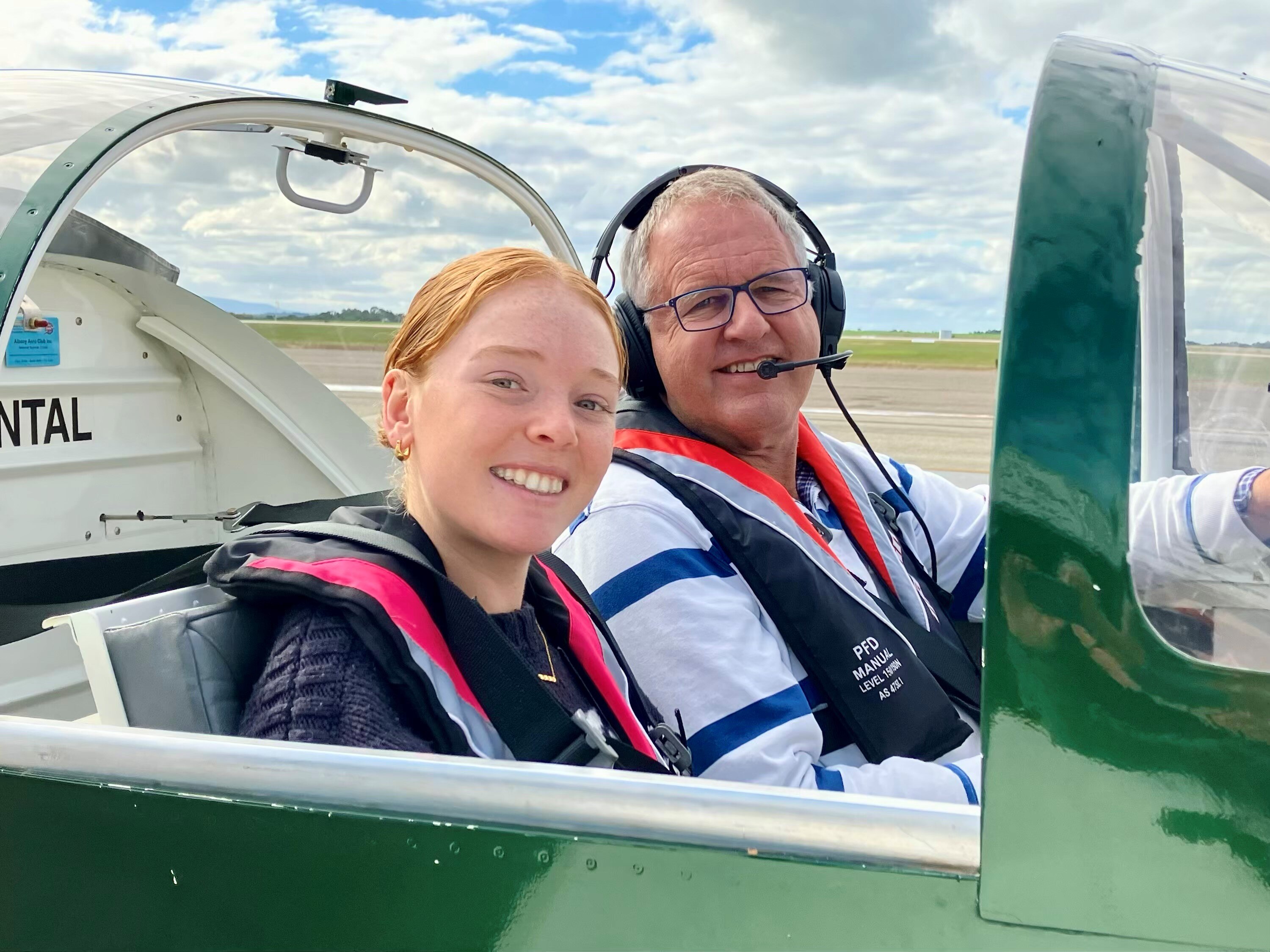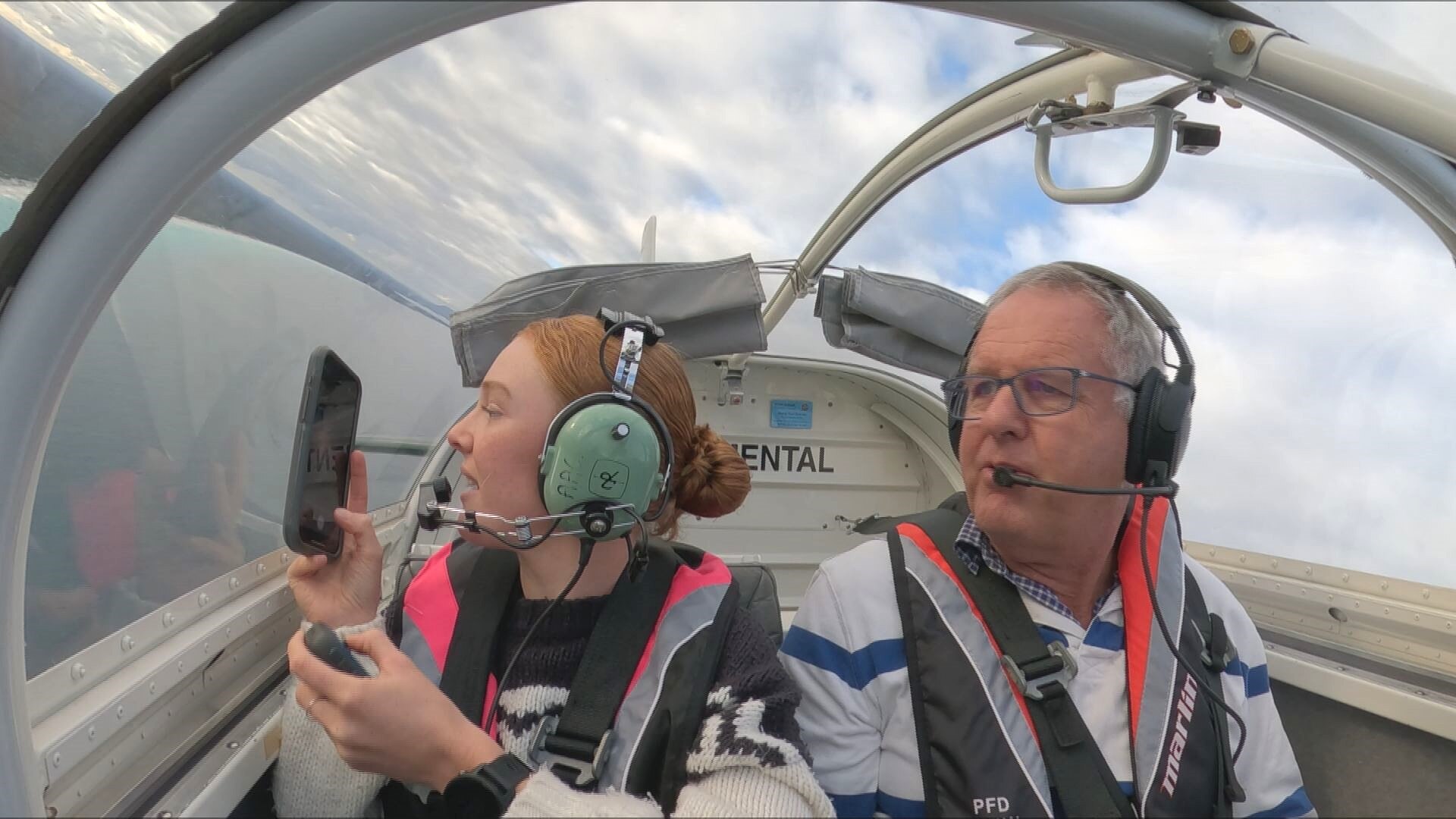 Researcher Kimberley Johnson and pilot David Ellett fly along WA's south coast spotting southern right whales as part of the project. (ABC Great Southern: Mark Bennett)