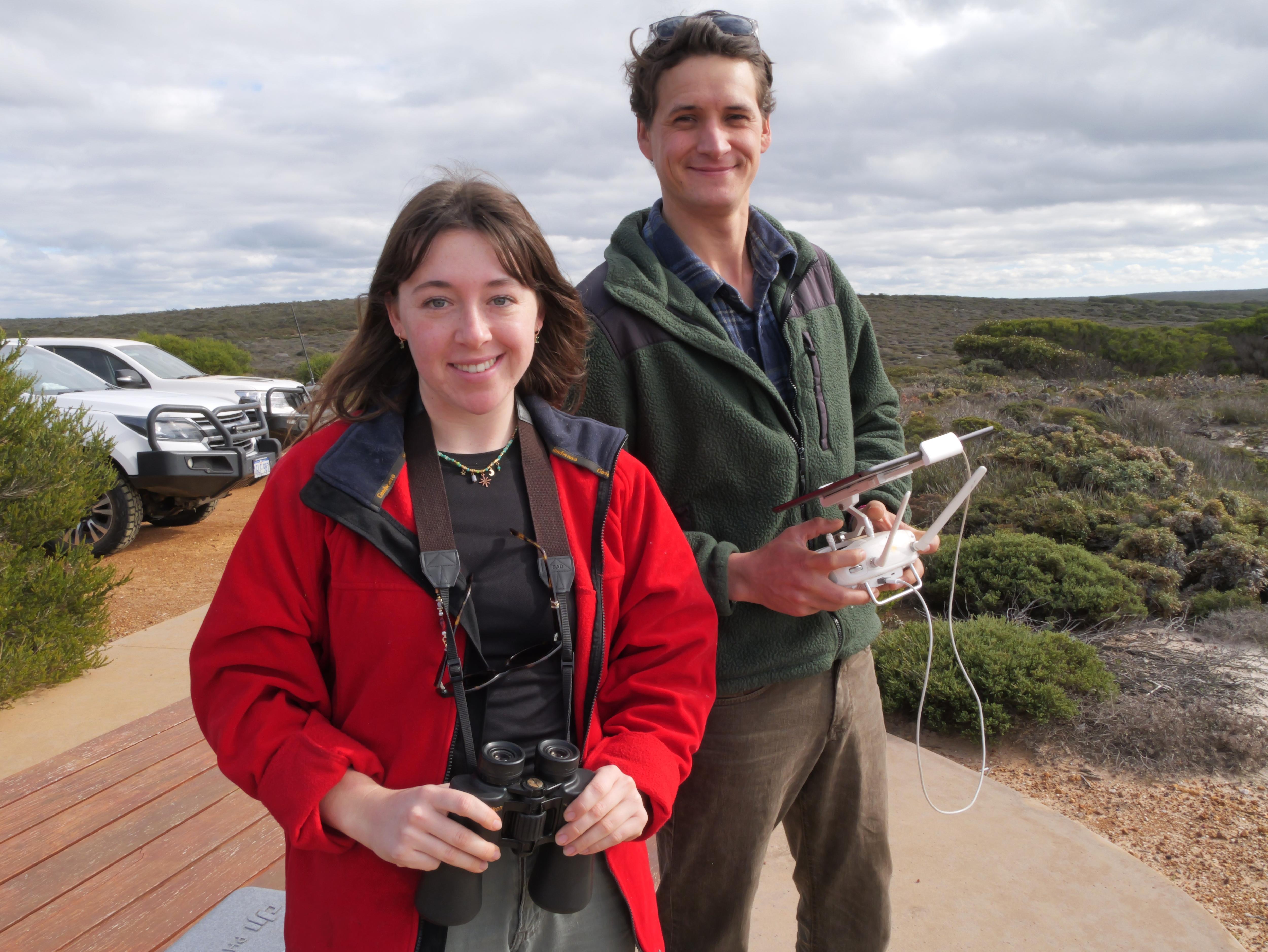 Volunteer marine researchers Holly Butterworth and Max Fabry photographing southern right whales at Point Ann. (ABC Great Southern: Mark Bennett)