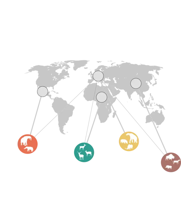 Illustration of the Global network of ecological roles among large herbivores, different species on different places and over time, but with the same ecosystem role.