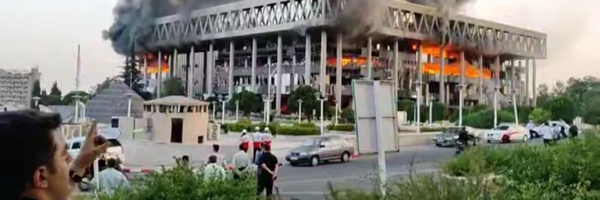 A screengrab of video footage shows the headquarters of Islamic Republic of Iran Broadcasting on fire following an Israeli attack on June 16, 2025.