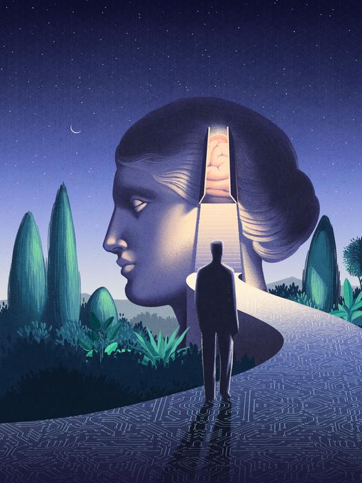 This illustration titled, "Gateway to Memory," illustrates Dr. Singer's and Jeong's research and how interneurons act as gatekeepers that open specifically on paths to important locations to enable learning for those places. This art imaginatively represents this inhibitory gating as a monolithic gate opening and spilling light onto the crucial path, guiding the seeker toward their goal.