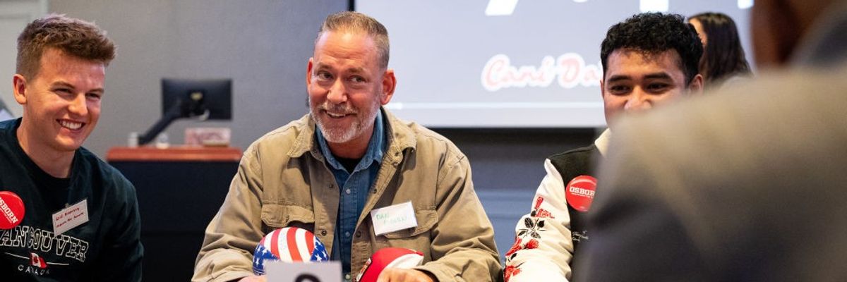 Independent Senate candidate Dan Osborn, challenger to Sen. Deb Fischer (R-Neb.), speaks with students during the candidate forum at the UNO (University of Nebraska Omaha) candidate forum in Omaha, Nebraska on Tuesday, October 15, 2024.