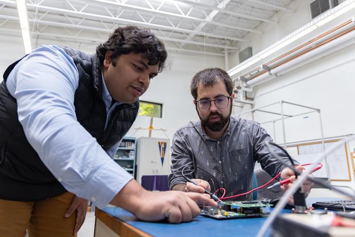 UC Davis graduate students Ayush Patnaik (left) and Adam Zufall (right) working on a payload that will travel into space this fall. The payload is a digital twin that will use AI software to measure the activity and predict the future state of the battery. Developed at the UC Davis Center for Space Exploration Research, it is a step towards fully autonomous spacecraft. The project is in collaboration with a company, Proteus Space.