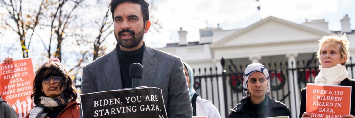 New York state Rep. Zohran Mamdani (D-36) speaks outside the White House to announce a hunger strike to demand that President Joe Biden "call for a permanent cease-fire and no military aid to Israel," on November 27, 2023.
