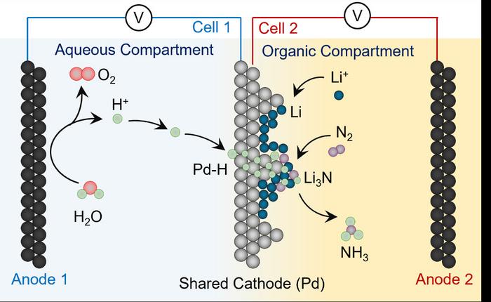 However, the researchers have found a way to extract hydrogen directly from the splitting of water and transfer it to nitrogen. They used a palladium (Pd) foil as both an electrode and a membrane. “Palladium can serve as a membrane because it allows hydrogen atoms to pass through,” reports Kornienko. In the experiment, the Pd foil separated an anhydrous reaction environment, in which the LiNRR reactions take place, from a water-based reaction environment. “In the end, we were able to extract hydrogen atoms electrochemically directly from the water and transfer them to the reactive lithium/lithium-nitrogen material to produce ammonia,” says the chemist.