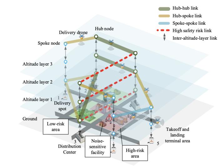 A key innovation is the adoption of a multi-layered hub-and-spoke network structure, where nodes (takeoff/landing points and delivery centers) are mapped onto different altitude levels, and links represent horizontal drone flight paths. The model incorporates population-density-based risk zoning and classifies noise-sensitive facilities such as residential areas as constraints.